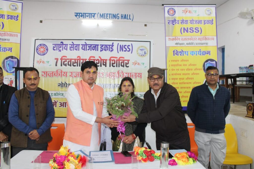 आज दिनांक 23 मार्च 2026 को राजकीय स्नातकोत्तर महाविद्यालय गोपेश्वर चमोली की एनएसएस इकाई द्वारा सात दिवसीय विशेष शिविर का उद्घाटन किया गया। यह शिविर राजकीय इंटर कॉलेज माणा घिँघराण में दिनांक 23 मार्च से 29 मार्च, 2026 तक आयोजित किया जा रहा है। इस अवसर पर मुख्य अतिथि, जिला पंचायत अध्यक्ष चमोली दौलत सिंह बिष्ट ने कहा कि राष्ट्रीय स्वयंसेवा इकाई एक सामुदायिक सौहार्द, पारस्परिक सहयोग एवं समाज में एकजुटता व समरसता लाने के उद्देश्य से कार्य करती है। इन्हीं गुणो को युवाओं में विकसित करने हेतु इस प्रकार के शिविरों की एक महत्वपूर्ण भूमिका होती है। उन्होंने संपूर्ण उत्तराखंड को नशामुक्ति के बनाने लिए युवाओं को प्रेरित किया जिससे वह देश के विकास में अपना संपूर्ण योगदान दे सके।